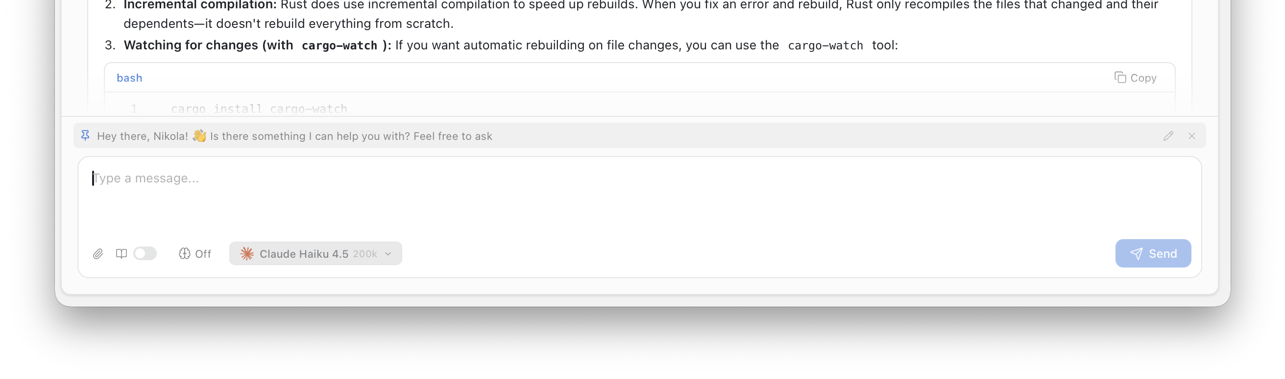 Anchors (or pins) let you mark important messages using the pin button that appears on hover. This is very useful for keeping focus within long conversations. Good for you, but also for the agent, since each anchored message is always included in the context. The agent never forgets about the important things.