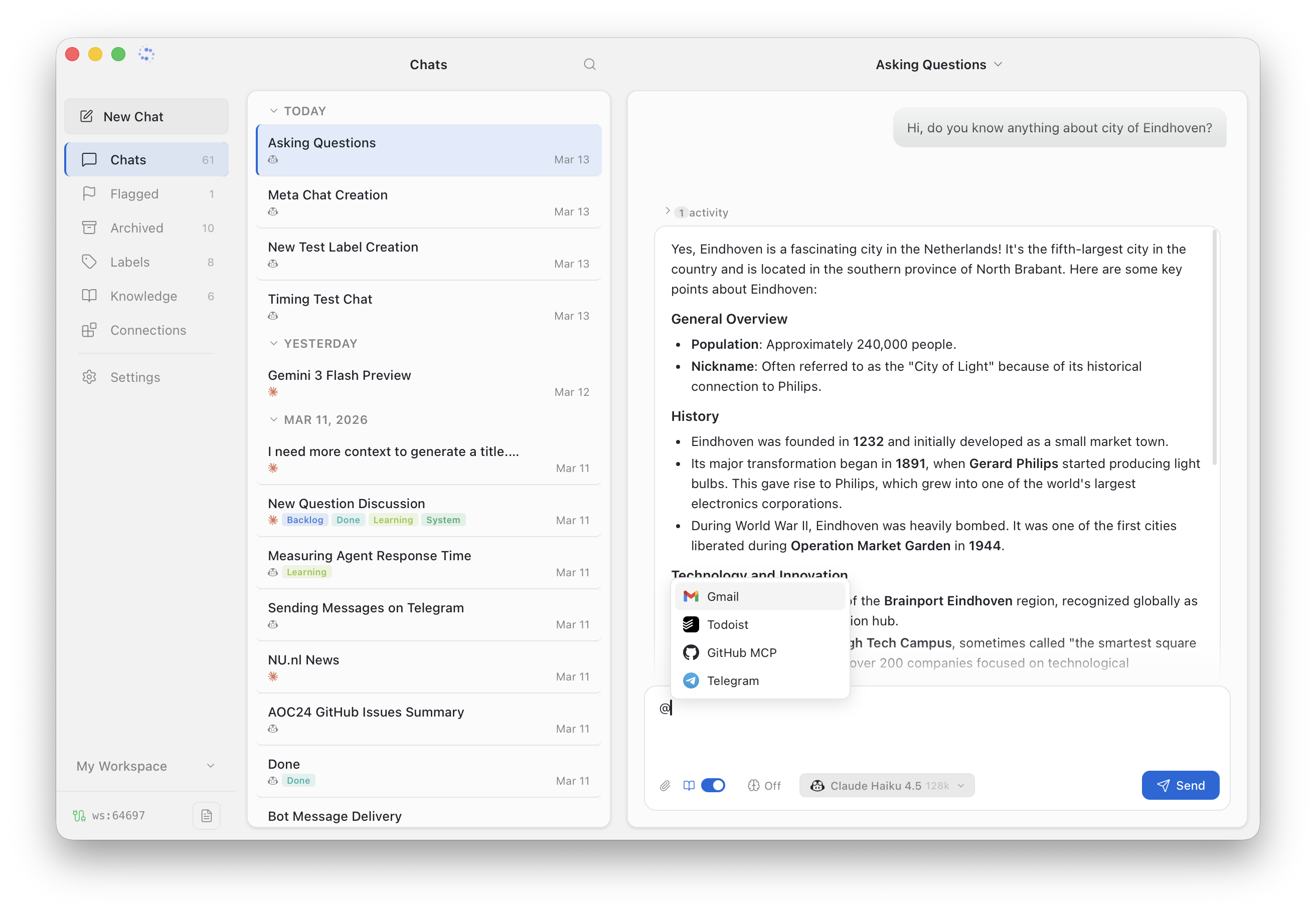 Each chat starts with your default LLM settings: provider, model, thinking level, and knowledge. You have full control over the interaction on a per-message basis. Before asking the next question, you can switch providers, change the model, adjust the thinking level, or toggle whether the agent should use your local document knowledge. All of these options are accessible directly above the input field.